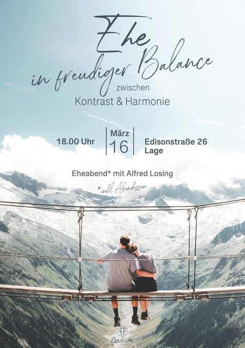 An diesem Eheabend wollen wir uns mit dem Thema „Ehe in freudiger Balance. Zwischen Kontrast&Harmonie“ beschäftigen. Alfred Losing wird der Redner sein. Wir werden auch gemeinsam ein Abendessen genießen. Meldet euch gerne in den Anmeldelisten an, die im Foyer liegen.