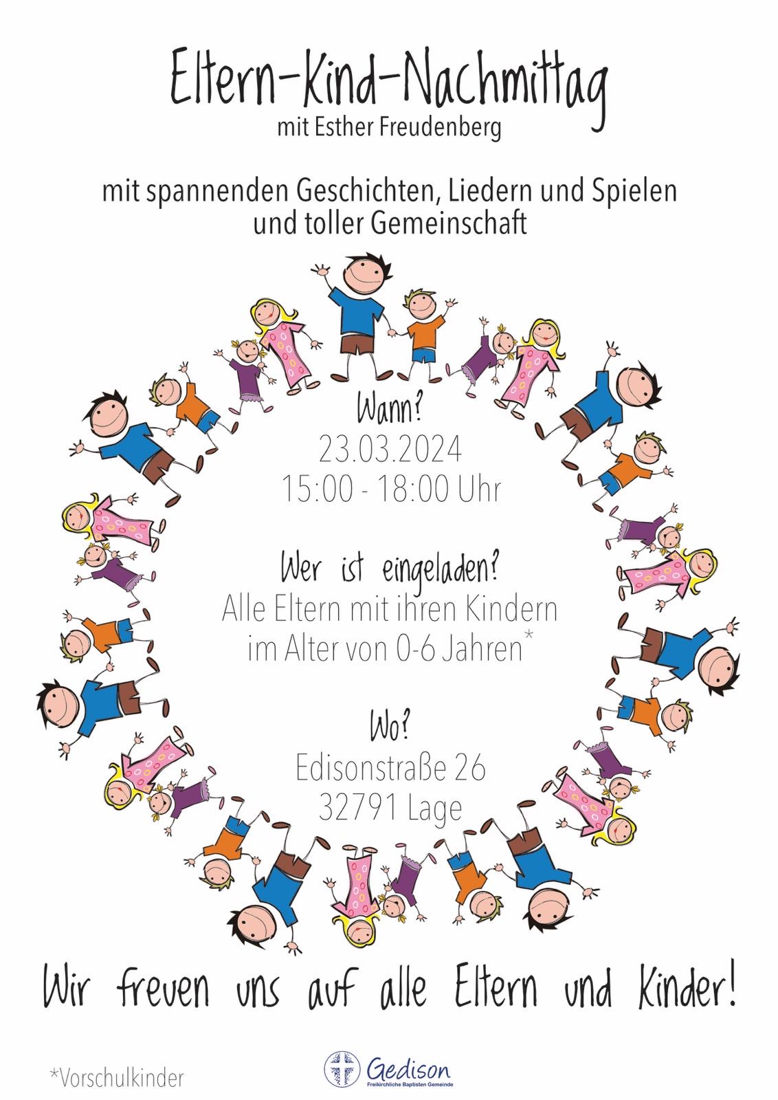 Es findet ein Eltern-Kind-Nachmittag statt, zu dem alle Eltern mit ihren Kindern von 0-6 Jahren eingeladen sind.